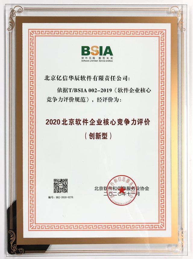 今年,北京軟協(xié)聚焦北京市軟件和信息服務(wù)業(yè)內(nèi)的優(yōu)秀企業(yè),依據(jù)《軟件企業(yè)核心競爭力評價規(guī)范》(T/BSIA 002-2019),從企業(yè)規(guī)模、經(jīng)營業(yè)績、研發(fā)能力、創(chuàng)新成果、質(zhì)量保證五個維度進(jìn)行層層審核,優(yōu)中選優(yōu)。最終,億信華辰憑借自身在信息化領(lǐng)域的創(chuàng)新能力脫穎而出,獲得了"創(chuàng)新型"評價。