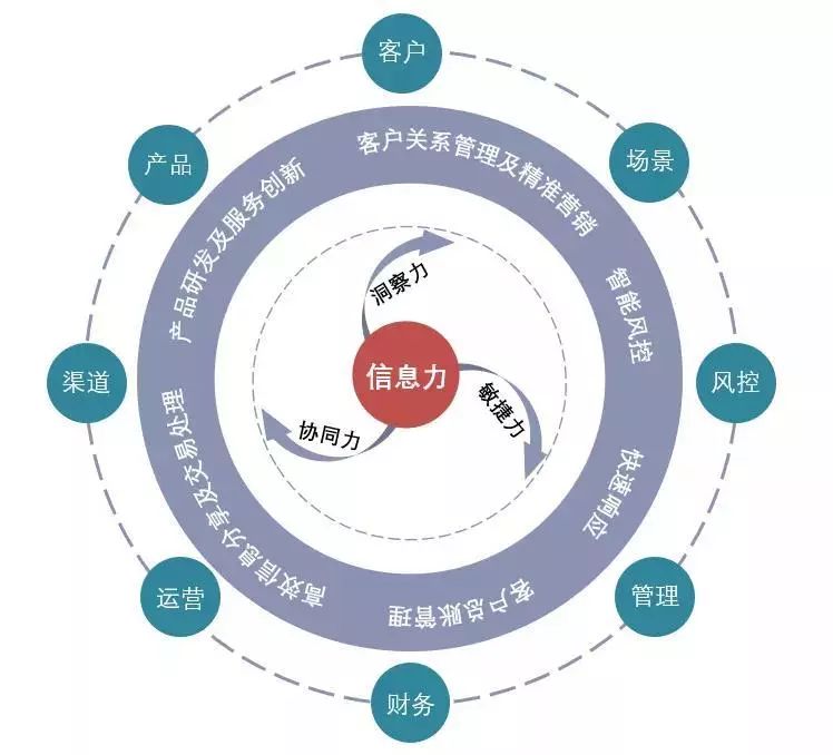 依托于高效信息分享及交易處理、快速響應的敏捷服務能力,銀行的產品與服務可以無處不在,銀行的客戶也可以隨時隨地使用銀行的產品和服務。總之,在信息力的核心驅動下,洞察力、協(xié)同力、敏捷力既獨立發(fā)揮作用也相互協(xié)同演進,催生企業(yè)的客群擴展、產品升級、渠道形態(tài)變遷、營銷方式變化以及商業(yè)模式創(chuàng)新,最終使企業(yè)通過全面的數字轉型獲得新的核心競爭力。
