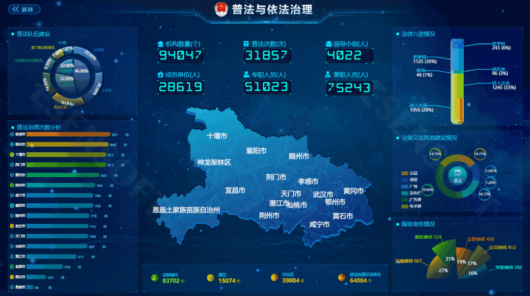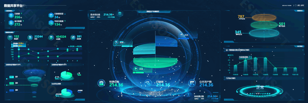 —TOP 2— 法制宣傳大屏 最佳分辨率:1920*1080 使用場景:了解普法工作的推進情況,包括隊伍建設、媒體宣傳、各個縣市的大數據對比等,對于有法制宣傳,法律服務等需求的行業提供大屏承載方案,助其成為暢通社情民意、服務保障民生的監管新陣地。 展現邏輯:使用樣式各異的圖表,展示法律行業內的不同需求的數據,根據地理位置等信息數據,直觀、便捷的展現數據結果,讓人一目了然。 —TOP 3— 數據共享大屏 最佳分辨率:4800*1620 使用場景:將數據集中到數據共享平臺,實現多數據源管理,透明化的服務支持,使得數據資源可觀、可感、可控,智能化的提出數據共享側的建議。最終,加強決策和預測能力從而提升公司整體數據管理水平。 展現邏輯:實時展示數據資產申請情況、元數據情況、數據質檢情況、數據安全、執行情況等信息,并添加大量的動畫效果使其充滿科幻感。
