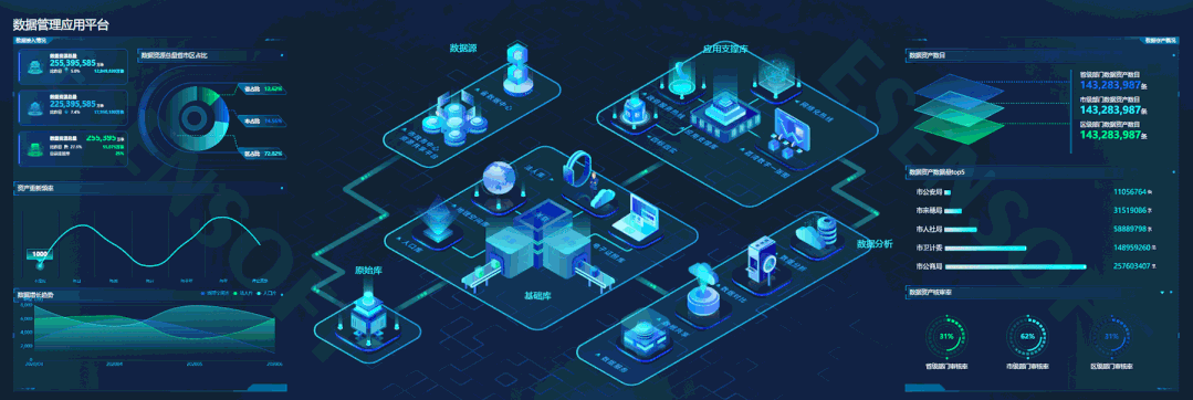 別急,稱得上是可視化領域的種子選手:億信ABI的大屏模塊——酷屏帶著一籮筐解決方法來了,該系統內置18套精美且免費的大屏模板,用戶可一鍵套用,助您快速高效地制作出酷炫大屏。 如果還“不滿足”,咱們酷屏市場還會定期更新時下最酷最IN的模板與組件,用戶可自行試用和購買。今天小億給大家分享酷屏市場中最受歡迎的5套模板,來看看這些“高顏值”模板的應用場景吧,文末有獲取鏈接哦! —TOP 1— 數據管理應用大屏 最佳分辨率:4800*1620 使用場景:精準對接政企的數據治理的可視化需求,利用動態的圖表將數據的流轉狀態清晰展示,明確數據治理的路徑和流程。另外,各個部門的數據資產使用狀況和資源利用率得以清晰地展現,對于管理者來說可以及時并針對性的提出解決方案。 展現邏輯:中心以動畫效果展示數據管理應用的整個流程,實時展示數據接入情況、數據增長趨勢、數據資產概況等信息。