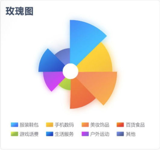 玫瑰圖適合用于對比各類別的數據,而相比柱圖/條形圖等圖表類型來說,南丁格爾玫瑰圖能夠放大數據差異。因為它使用扇區半徑來表示數據的大小,半徑和面積的關系是平方的關系,用戶直覺上會通過面積來感知差異,所以它會將數據的比例大小夸大。